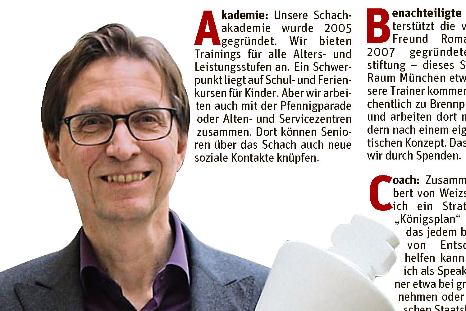 Die Schachwelt schaut auf Dubai: Noch bis Mittwoch, 15. Dezember, kämpft der Norweger Magnus Carlsen, Weltmeister seit 2013, gegen den russischen Spieler Jan Nepomnjaschtschi um seinen Titel. Die insgesamt 14 Partien besonders im Blick hat Stefan Kindermann: Der Schwabinger, der seit 1988 Schach-Großmeister ist, analysiert für die Süddeutsche Zeitung alle WM-Spiele. Von 1978 bis 1996 selbst Profispieler, leitet er heute die Münchener Schachakademie (MSA) und ist Vorstandsvorsitzender der Schachstiftung. Wie diese benachteiligte Kinder fördert und wieso der 61-Jährige Führungskräften Intuition lehrt, verrät er von A bis Z. Text:Romy Ebert-Adeikis